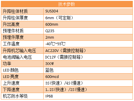 升降柱體采用304不銹鋼材質,抗生銹、耐腐蝕