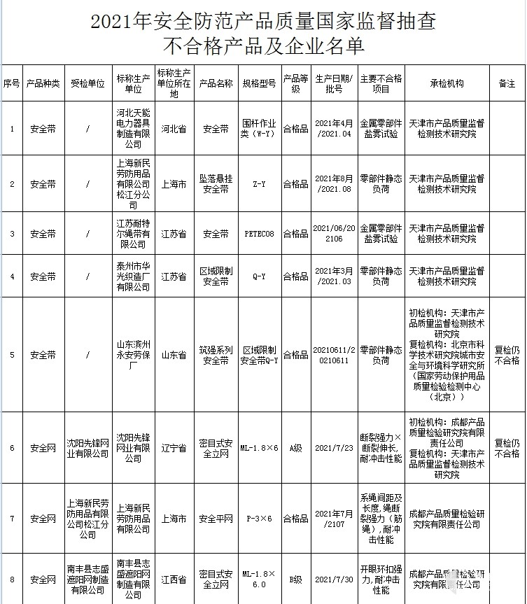 安全帶、安全網、鎖具、人民幣鑒別儀等4種安全防范產品,共發現12批次產品不合格,不合格發現率為5.0%。本次跟蹤抽查到上次不合格企業8家,有1家企業本次抽查仍不合格,7家企業合格。