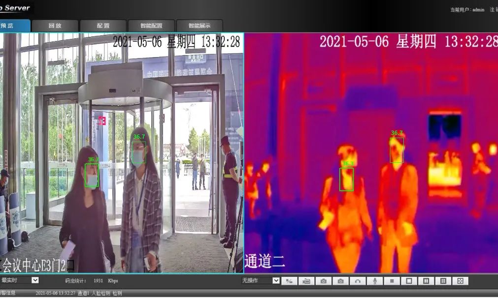 leyu.樂(lè)魚(yú)還向展會(huì)贊助了多臺(tái)雙目熱成像攝像機(jī),用于觀眾入場(chǎng)實(shí)時(shí)測(cè)溫和記錄現(xiàn)場(chǎng)人流,這款攝像機(jī)利用可見(jiàn)光人臉檢測(cè)綁定熱成像技術(shù)實(shí)現(xiàn)實(shí)時(shí)精準(zhǔn)測(cè)溫。不僅為展會(huì)防疫助力,也讓更多觀眾們更近距離的體驗(yàn)了leyu.樂(lè)魚(yú)測(cè)溫產(chǎn)品。