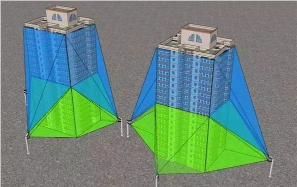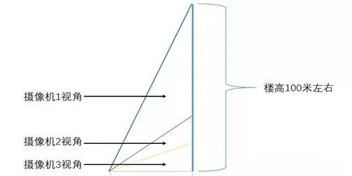 對于一個樓高在100米左右的大樓來說,可以通過3個相機(jī)進(jìn)行覆蓋,一個攝像機(jī)照0—15米的高度,一個攝像機(jī)照15-30米的高度,一個攝像機(jī)覆蓋30-100米的高度: