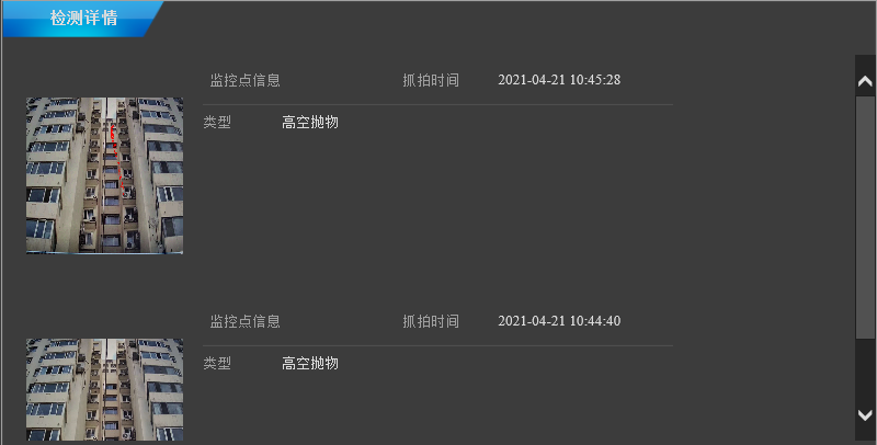 檢測詳情可看到詳細(xì)抓拍時間,識別“高空拋物”軌跡,實現(xiàn)實時追溯↓↓